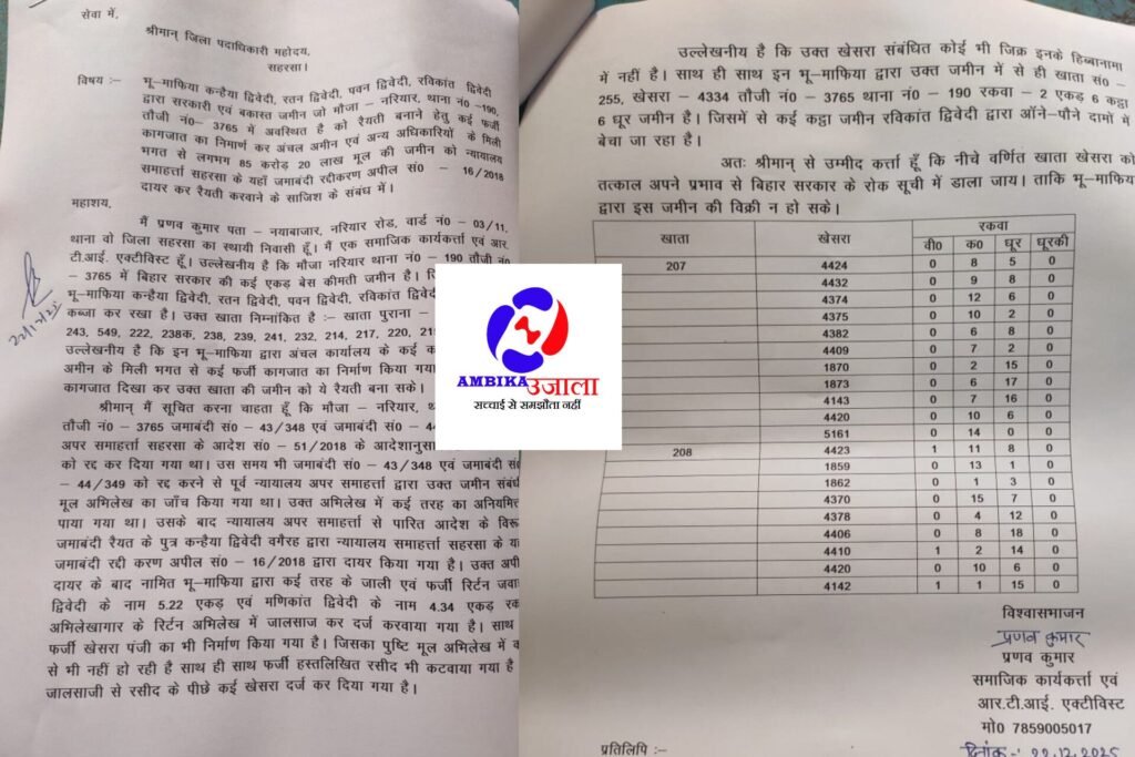 बिहार के सुशासन के दावों को झटका देते हुए सहरसा जिले के नरियार क्षेत्र से एक चिंताजनक भ्रष्टाचार का मामला उजागर हुआ है। स्थानीय भू-उत्पीड़कों ने राजस्व विभाग के भ्रष्ट तत्वों के साथ मिलकर करीब 85 करोड़ 20 लाख रुपये कीमत वाली बहुमूल्य सरकारी और बकास्त भूमि पर अवैध कब्जे की चाल चली है। यह फर्जीवाड़ा प्रशासनिक तंत्र की कमजोरी को बेनकाब करता है, जहां स्थानीय मीडिया से लेकर अधिकारी तक चुप्पी साधे हुए हैं। नयाबाजार के निवासी प्रखर RTI कार्यकर्ता और सामाजिक योद्धा प्रणव कुमार ने इस सिलसिले को सामने लाकर जिला मजिस्ट्रेट को शिकायती आवेदन सौंपा है।